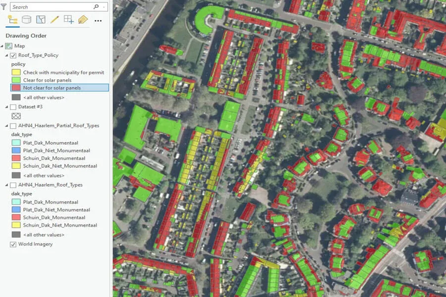 De Gemeente Haarlem wilde een kaart waarop burgers van de binnenstad in één oogopslag konden zien of hun dak geschikt was voor zonnepanelen. Om dit vast te stellen moest er per woning en per dakdeel vastgesteld worden of het plat of schuin was, of het een monumentaal pand was en of de dakdelen vanaf de openbare weg zichtbaar waren. Dit handmatig in kaart brengen was extreem arbeidsintensief. Avineon Tensing heeft de Gemeente Haarlem geholpen met dit datavraagstuk. Details leest u in onze casestudie over dit project. Onderstaand screenshot geeft u een 2D beeld van het resultaat.