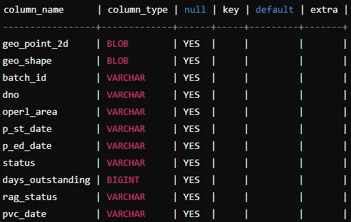 This returns a table with columns like geo_point_2d, geo_shape, batch_id, dno, and more.