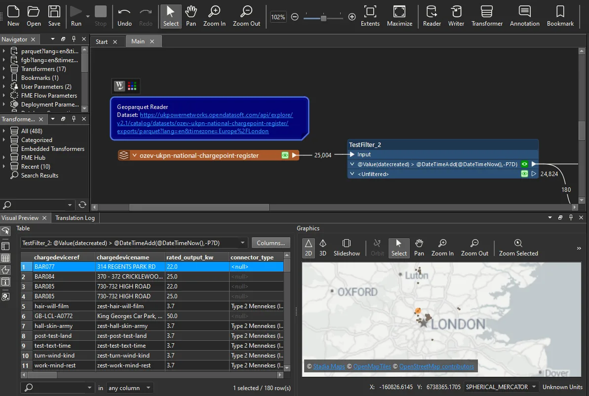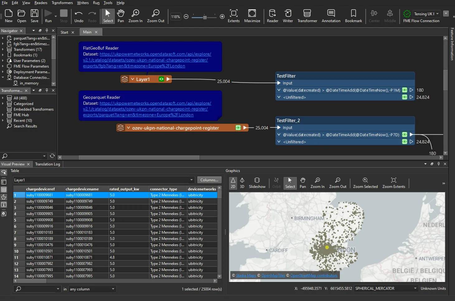 The UKPN open dataset makes available the National Chargepoint Register (NCR) database of publicly available charge points for electric vehicles, this is updated daily and covers all of UKPNs network area. This is a big dataset, over 25,000 locations and growing - data download page. To add the data in FlatGeoBuf and Geoparquet, open up the respective FME readers and copy in the URLs.