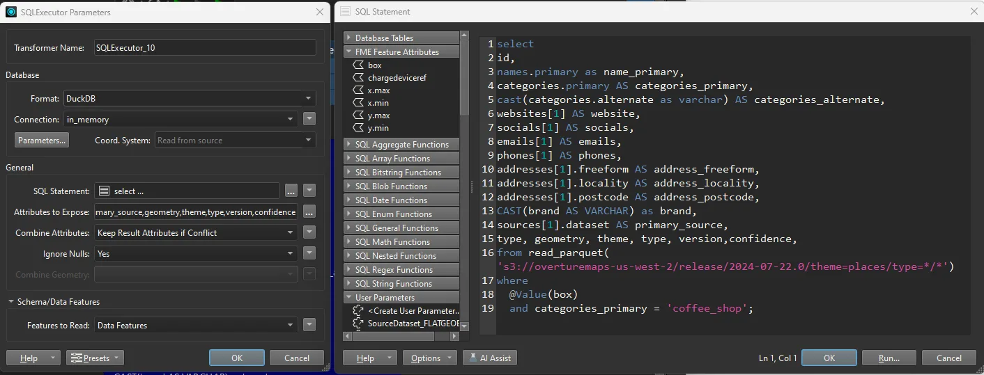 Lets now move things up a notch, at the start I mentioned that FME support for DuckDB was exciting. Using FME 2024.1 and above you can submit queries to DuckDB via the SQLExecutor transformer, when you need to query a huge dataset stored online in geoparquet format, you can now do so. No need to copy the whole dataset.