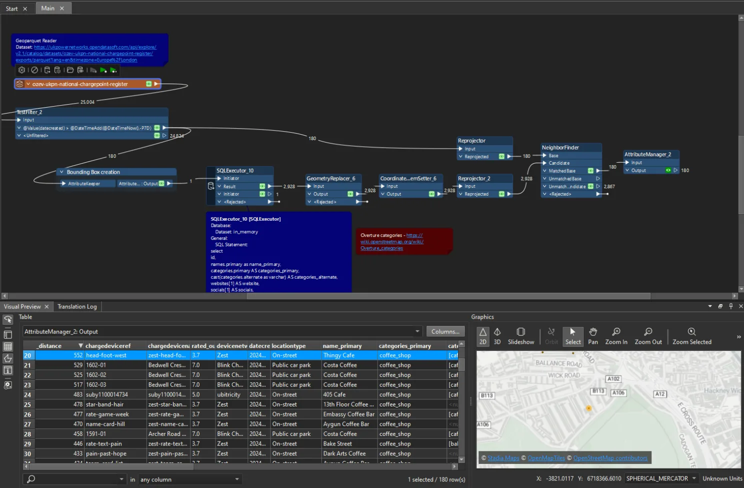 Imagine you're a savvy coffee business looking to set up shop near a new car charging station, where there's little to no existing competition. For fun, let's use FME to find newly installed charge points from UKPN open data in the last seven days and search the Overture Maps Places dataset to identify the closest coffee shop.