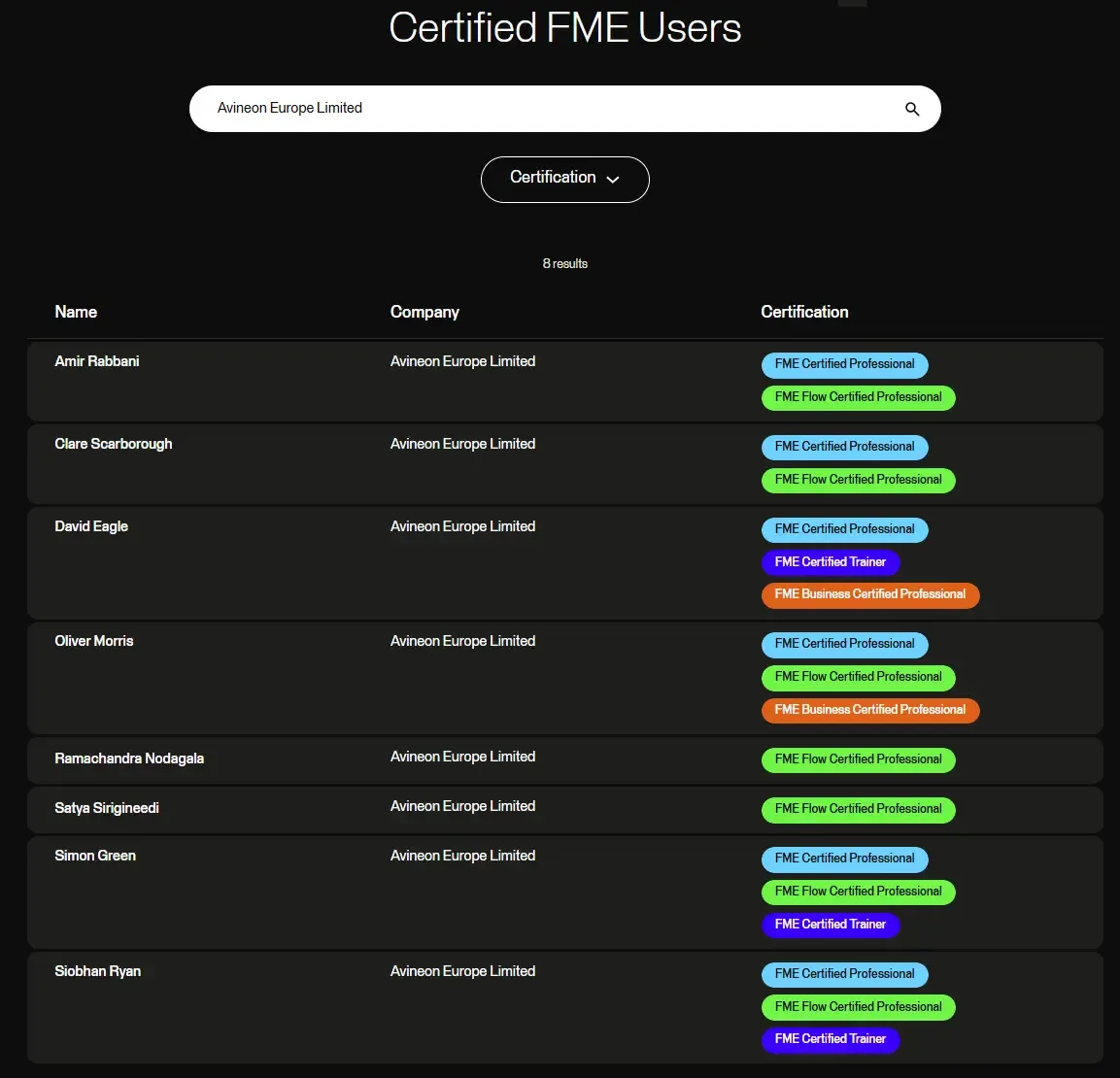 So when @mark2atsafe and @LizAtSafe helped bringing it back a couple of weeks ago, we were really happy. For us at Avineon Tensing in the UK, having our entire team certified isn't just a box to tick, it's about maintaining standards and about being able to confidently say that being up to date on our skills matters to us, a lot. We can help support you with your FME needs and of course, support you to get certified as well. And in a great user community like that of FME where people are sharing solutions and helping each other solve problems, having that visible commitment to staying current builts trust.