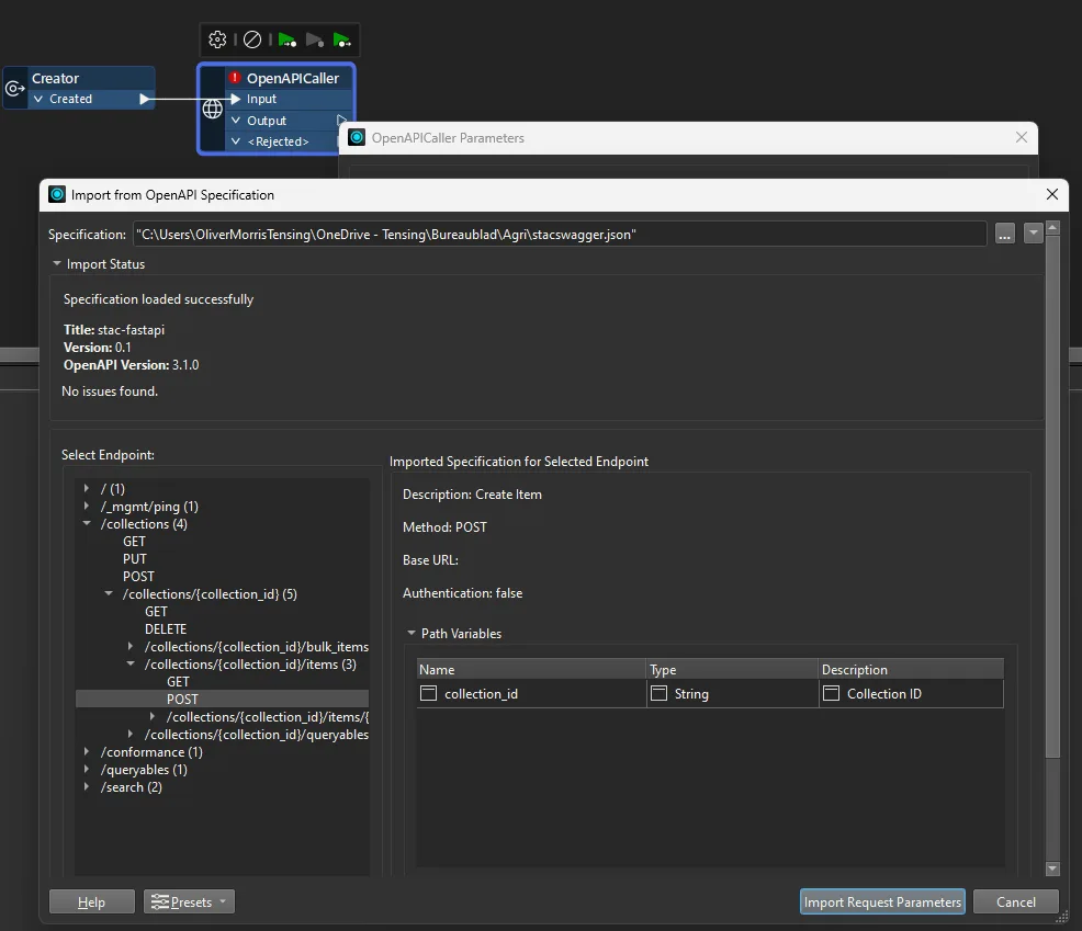 Figure 3: The OpenAPICaller in FME can load an OpenAPI Specification helping you find the right API endpoint for the task at hand – in this case, creating a new Item in STAC