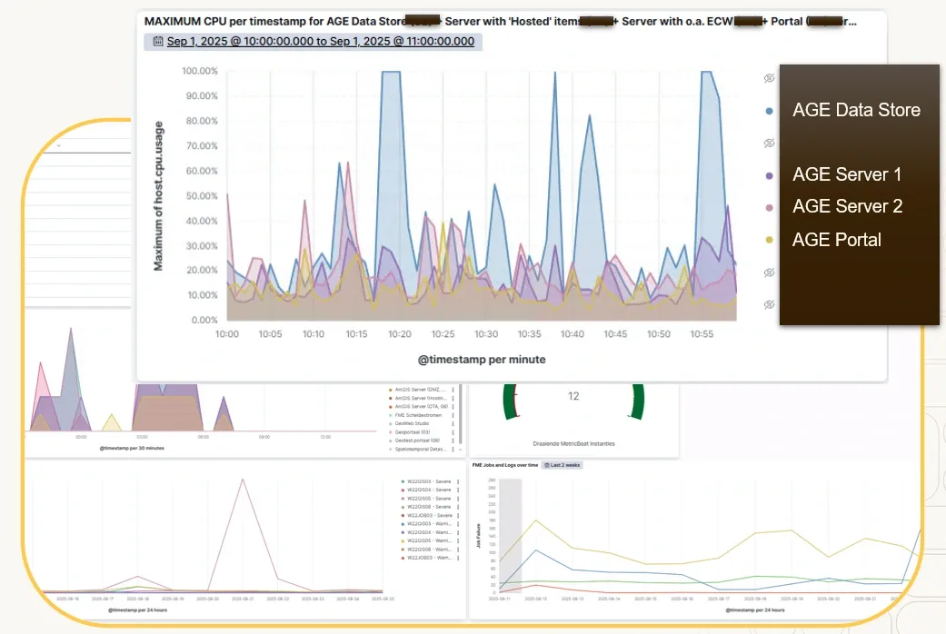 With high-frequency data collection, we track critical system-level indicators like server CPU load, memory consumption and available disk space. Allowing us to identify performance bottlenecks and resource constraints proactively and before they impact your end-users. Simultaneously, we monitor the quality of individual geo-services (including ArcGIS, FME jobs and OGC services), measuring response times and availability to ensure they meet defined standards.