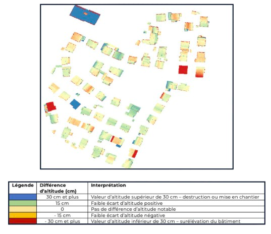 - La détection d’écart d’altitude entre le modèle numérique et les données LiDAR permettant d’identifier une modification sur une partie ou la totalité d’un bâtiment