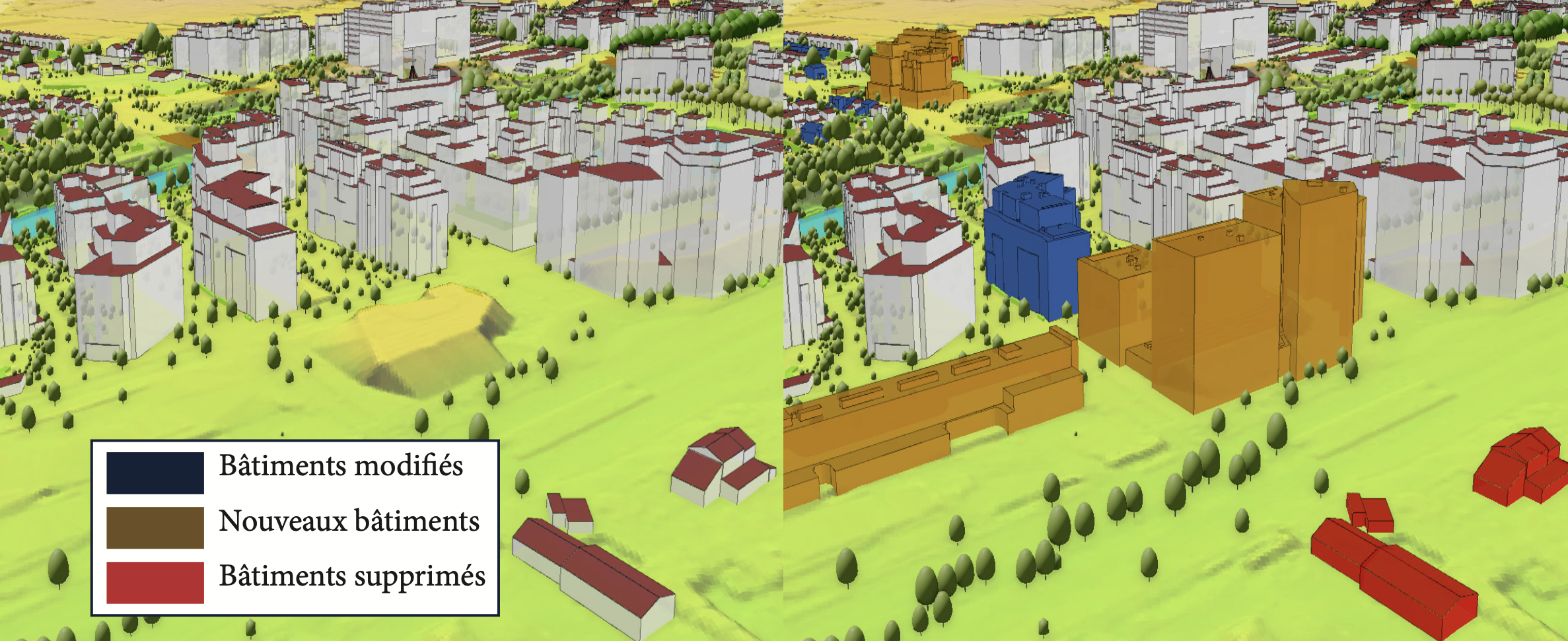 - L’élaboration d’un modèle numérique de référence à été réalisé sur des données géographique de 2020 par la saisie précise des bâtiments en trois dimensions et la détection de la végétation.