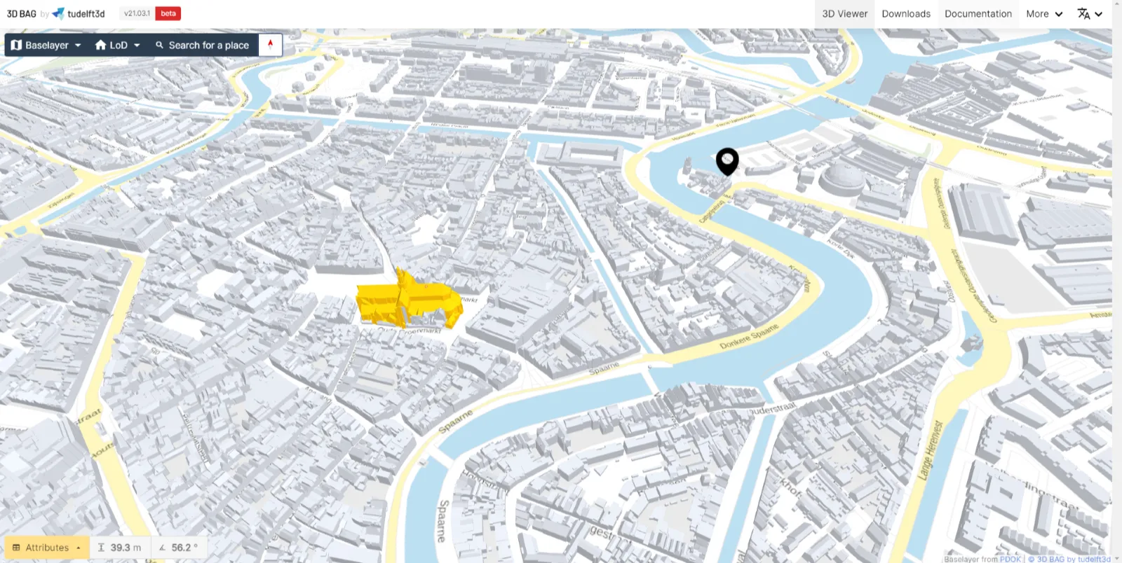 Omdat we ons richten op het tijdig bouwen van een nauwkeurig product, hebben we ervoor gekozen om de gegevens te gebruiken die al voor iedereen beschikbaar zijn, namelijk de 3D BAG-dataset die door de TU Delft is gepubliceerd op https://3dbag.nl/en/viewer. Deze gegevens zien eruit als de afbeelding hieronder en kunnen worden omgezet in de exacte dakdelen die we nodig hebben wanneer ze in 2D worden gelezen.