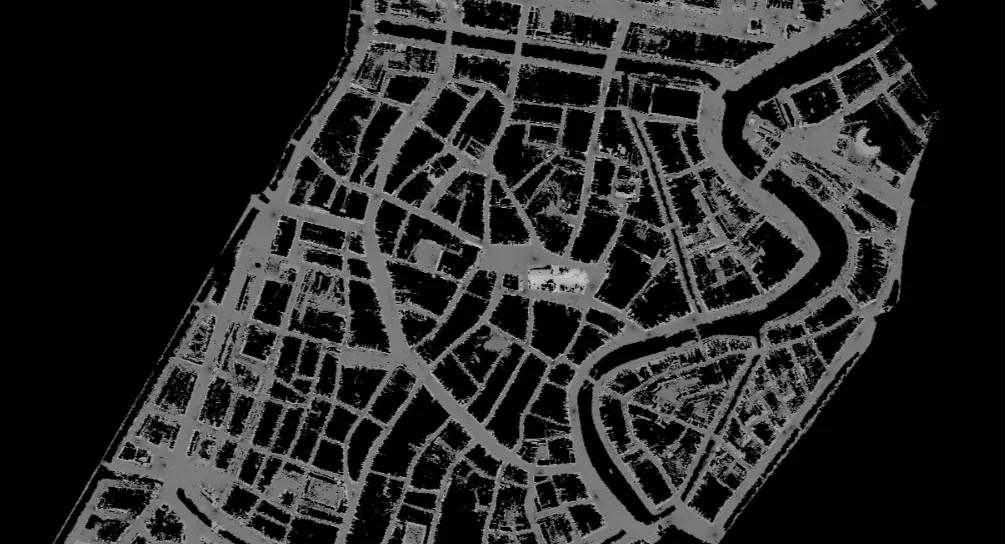 Op zichzelf lijken deze perspectieven niet erg informatief. Wanneer we echter de verschillende perspectieven op elkaar afstemmen, wordt het resultaat ineens een stuk duidelijker. In de afbeelding hieronder zien we een deel van de binnenstad waar alles wat grijs is vanaf de openbare weg te zien is.